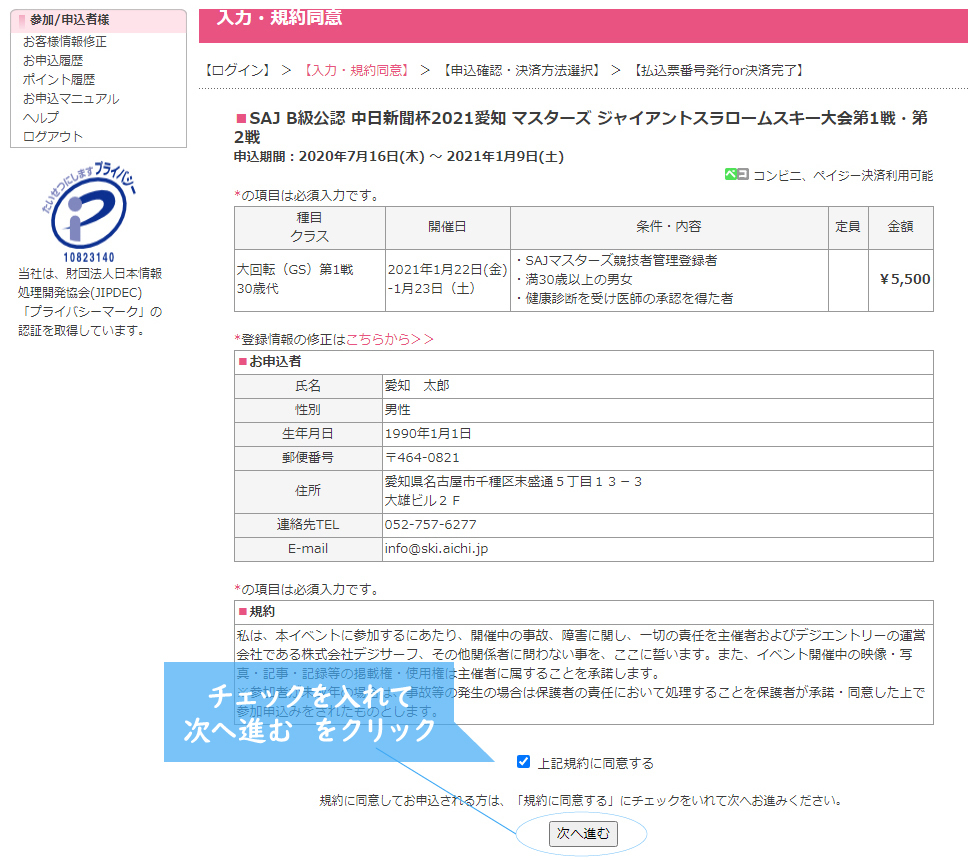 内容に誤り・不備がないことを確認し、規約をお読みの上、<上記規約に同意する>にチェックを入れて[次へ進む]ボタンをクリックしてください。