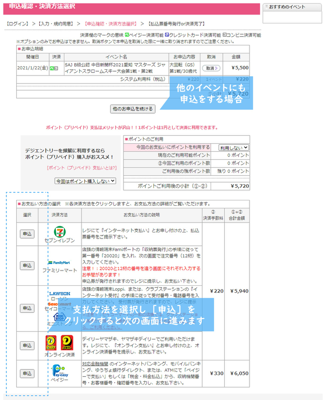 ほかに申し込みをしたいイベントがあれば、[他のお申込を続ける]をクリックし、前述の手順と同様に進めます。ほかにない場合は、支払方法を■お支払方法の選択 に表示されている決済方法から選び、左の[申込]ボタンをクリックします。クリックすると、次の画面