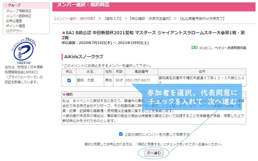 イベントに参加申込するメンバーを登録者一覧の左の申込欄のチェックボックスにチェックを入れます。参加者全員にチェックを入れたら、□上記の規約にメンバーを代表して同意する にチェックを入れて最下部の[次へ進む]をクリックします。