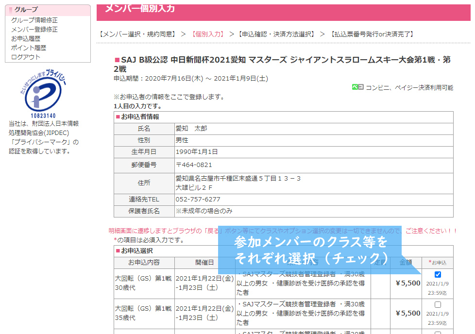 前画面で選択したメンバーのクラスなどをここで選択します。■お申込選択の表の内容から該当するものを選び、お申込の欄のチェックボックスにチェックを入れて次へ進んでください。