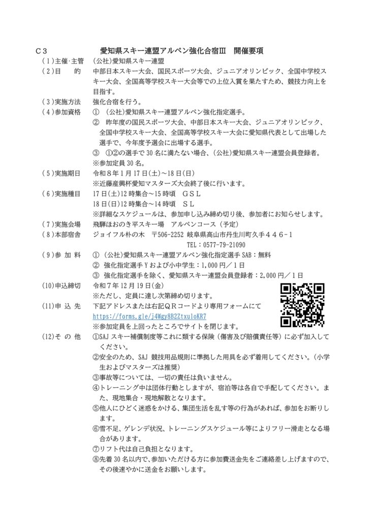 【追加行事】アルペン強化合宿C3の開催について 会場の都合がついたため、年鑑に掲載がなかった行事を追加開催します。下記要項ご参照の上、参加希望がありましたらお申込みください。 https://forms.gle/j4Wgy8B2Ztxu1oKR7